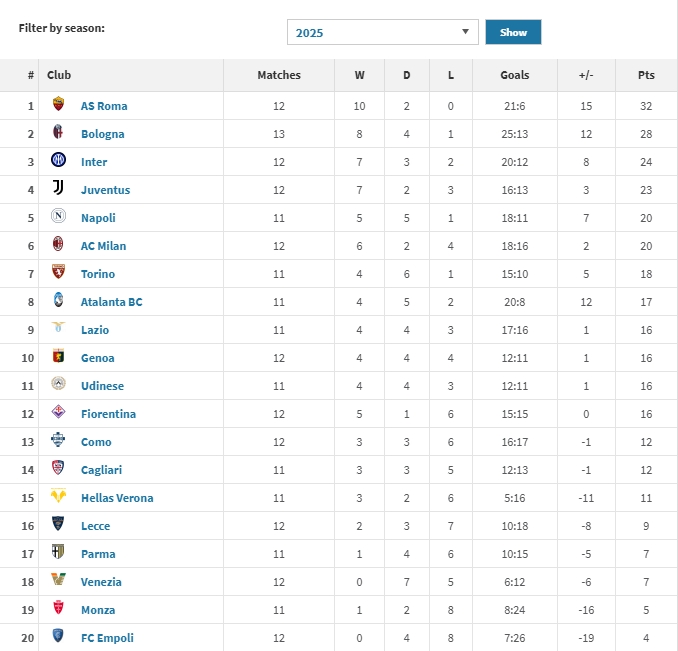 早來就爭冠了?意甲2025年拿分榜:羅馬32分領(lǐng)跑 博洛尼亞28分第2